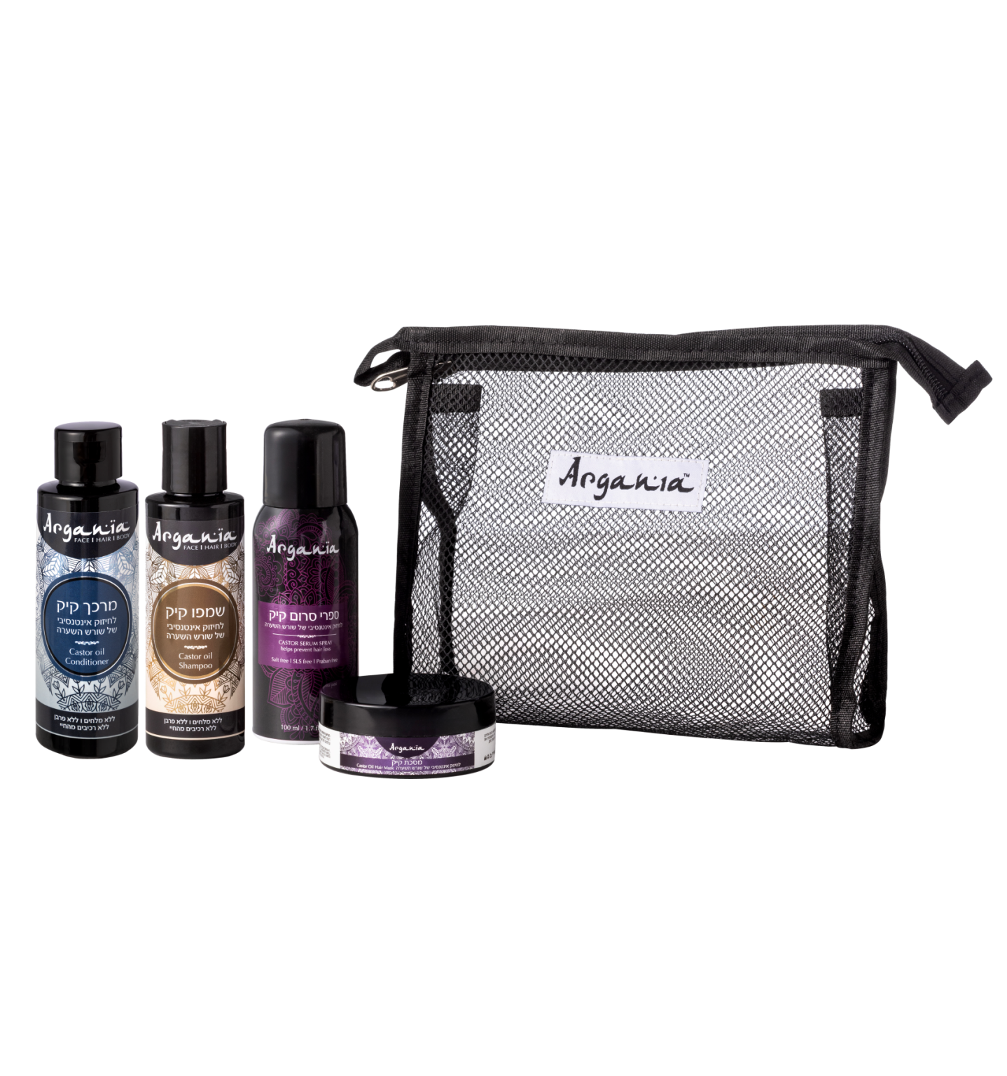 מארז נסיעות לשיער מבית Argania הכולל 4 מוצרי טיפוח חיוניים לשמירה על שיער בריא, רך ומלא ברק גם מחוץ לבית. מבוסס על שמן ארגן להזנה עמוקה, לחות והגנה מפני יובש ונזקי חום. מושלם לנסיעות, לחדר כושר או כמתנה שימושית.