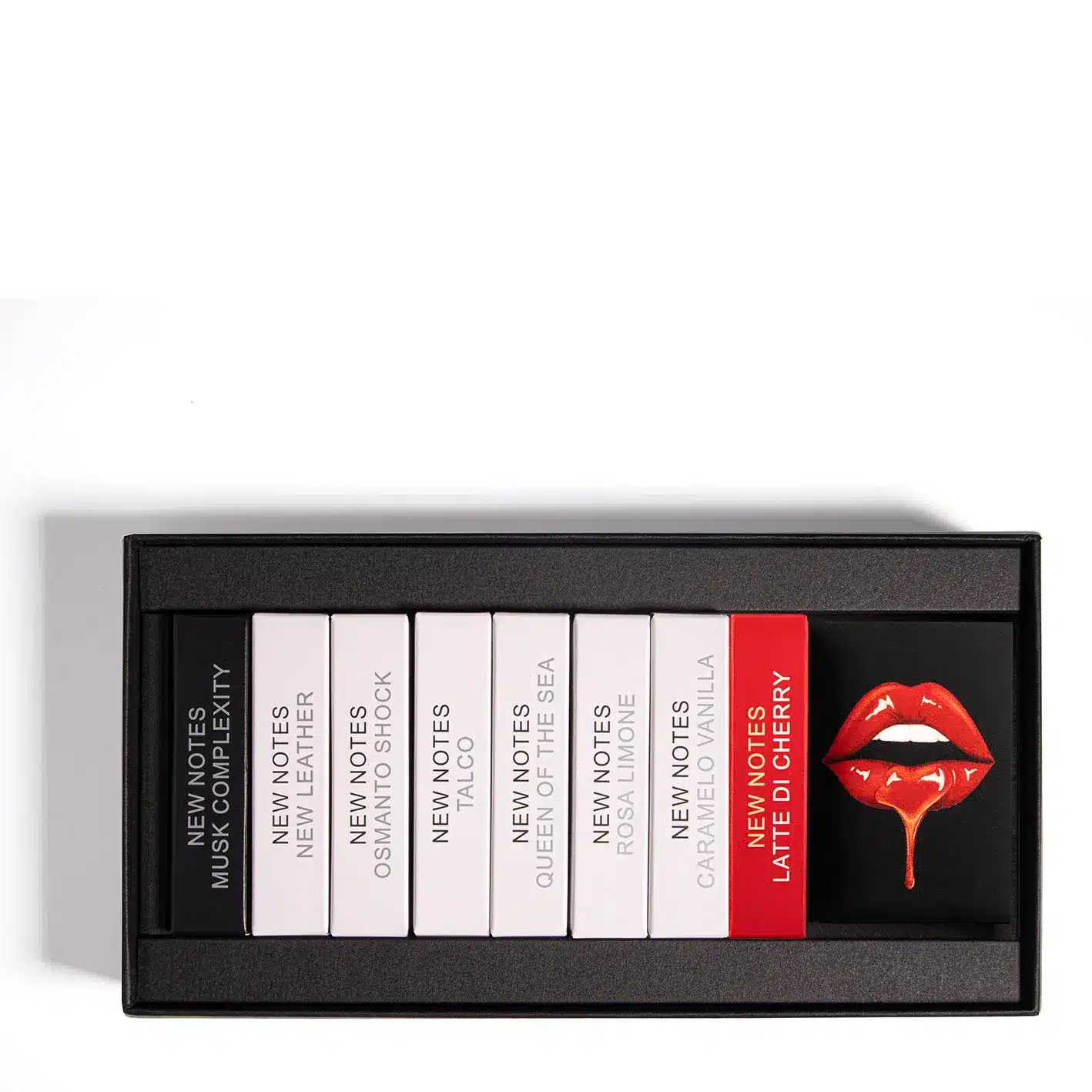 מארז התנסות של המותג ניו נוטס המכיל 8 ניחוחות בגודל 2 מ”ל: LATTE DI CHERRY, NEW LEATHER, CARAMELO VANILLA, TALCO, ROSA LIMONE, QUEEN OF THE SEA, OSMANTO SHOCK, MUSK COMPLEXITY